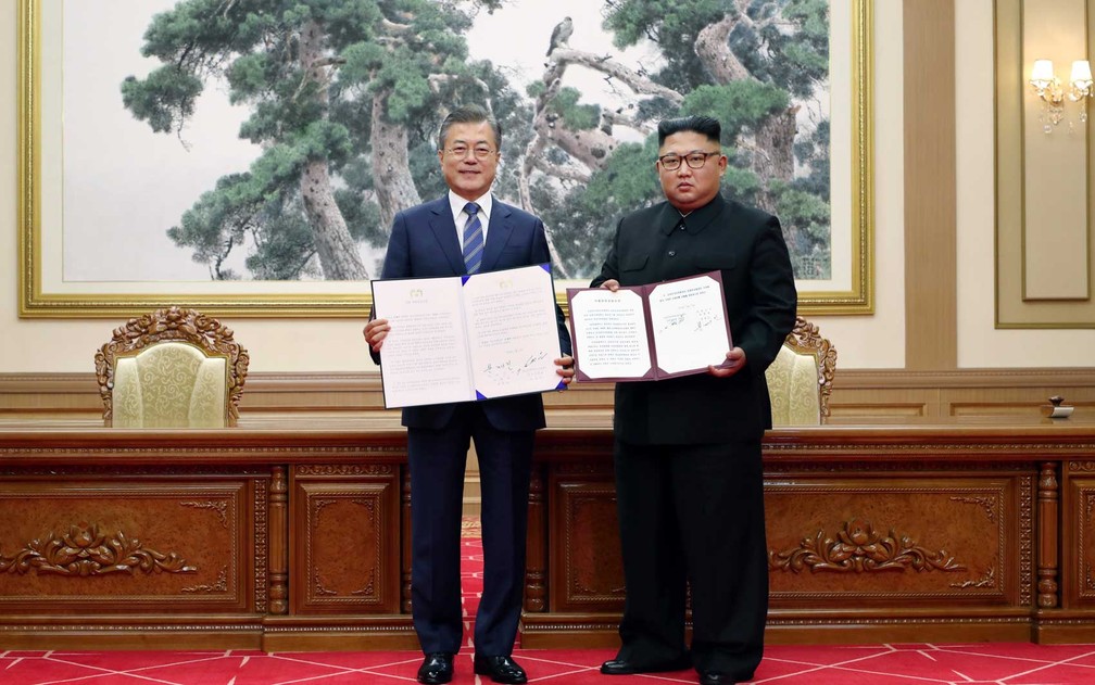 As duas Coreias também assinaram nesta quarta-feira um histórico acordo militar que reduz a possibilidade de confrontos entre seus respectivos exércitos ao redor da fronteira que compartilham. O ministro interino da Defesa da Coreia do Sul, Song Young-moo, e seu colega da Coreia do Norte, No Kwang-chol, assinaram o acordo durante a cúpula entre os líderes dos dois países, tecnicamente ainda em guerra. De acordo com o documento, as Coreias suspenderão a partir do dia 1º de novembro suas respectivas manobras ao longo da fronteira terrestre. Além disso, os dois países eliminarão 11 postos de guarda de fronteira antes do final do ano. Seul e Pyongyang também estabelecerão uma zona de restrição de voo perto da divisa e uma área em torno de fronteira marítima ocidental, onde manobras e exercícios com fogo real estarão proibidos. O documento é até hoje o acordo de maior importância para a redução da tensão militar entre dois países que permanecem em guerra desde 1950. O presidente sul-coreano, Moon Jae-in, insistiu antes de viajar para Pyongyang em que a ativação de um mecanismo deste tipo representa um grande passo para o estabelecimento da paz na península e para melhorar os laços entre dos dois países, algo que favorece, por sua vez, o diálogo da Coreia do Norte com os Estados Unidos sobre desnuclearização.