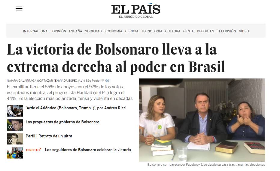 No jornal esquerdista espanhol El País, a notícia da eleição de Bolsonaro estampou a primeira página com a notícia “O ultradireitista Bolsonaro vence as eleições e será presidente do Brasil”, com coberturas também da repercussão regional em Estados brasileiros. O jornal define as eleições como a “mais polarizada, tensa e violenta em décadas” e marcada pelo triunfo da desinformação nas redes sociais. O site de notícias da rede britânica BBC noticiou como matéria principal da home a vitória de Bolsonaro no Brasil. A matéria afirma que “Bolsonaro fez campanha com a promessa de erradicar a corrupção e derrubar os altos níveis de criminalidade no Brasil”. Na página inicial do alemão Deutsche Welle, em inglês, a notícia principal se refere à eleição brasileira. O jornal descreve o dia de votação no Brasil como pacífico em grande parte e cita o acompanhamento da Organização dos Estados Americanos (OEA). O veículo destaca declaração de Laura Chinchilla, da OEA, que afirmou que a eleição se passou "sem relatos de violência ou qualquer outra dificuldade".