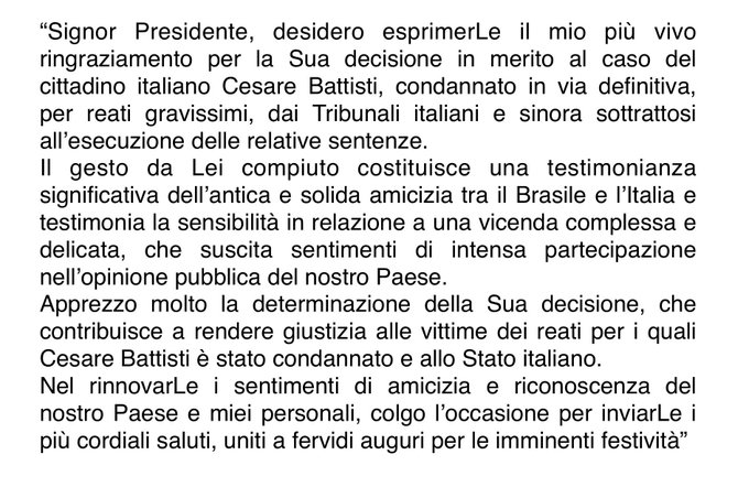 O presidente da Itália, Sergio Mattarela, enviou uma carta ao presidente Michel Temer em agradecimento ao decreto de extradição do italiano Cesare Battisti, condenado em seu país por quatro assassinatos nos anos 1970. O decreto foi assinado na sexta-feira, 14. "O gesto de Vossa Excelência constitui o significativo testemunho da antiga e sólida amizade entre Brasil e Itália e revela a sensibilidade em relação a uma situação complexa e delicada, que suscita sentimentos de intensa participação na opinião pública do nosso país", escreveu Mattarela na carta divulgada no Twitter do governo italiano.
