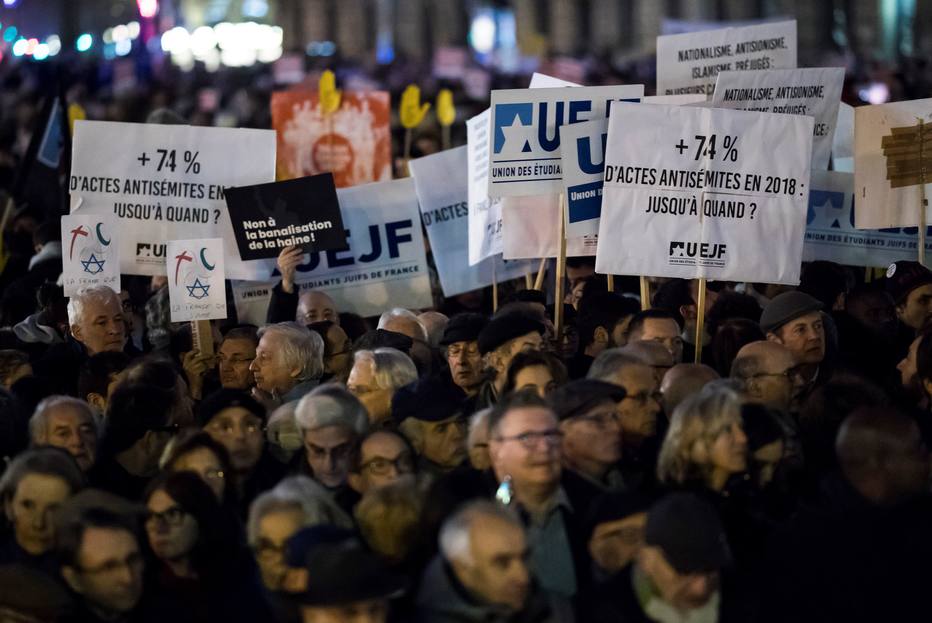 Milhares de pessoas se reuniram no centro de Paris na noite desta terça-feira (hora local), 19, em um protesto contra o antissemitismo. A manifestação foi convocada diante do aumento de agressões visando os judeus do país. Horas antes do ato na capital francesa, um cemitério judeu foi alvo de ataque e mais de 80 túmulos foram profanados com pichações de suásticas.Empunhando cartazes com os dizeres “Basta” ou “Não à banalização do ódio”, os manifestantes se reuniram na Praça da República, no centro de Paris. Simultaneamente, outra manifestação reuniu centenas de pessoas ao norte da cidade e diversos protestos foram organizados pelo país. A mobilização foi lançada por associações de defesa das minorias, com o apoio do governo e de personalidades politicais. A prefeita Anne Hidalgo, o secretário-geral do Partido Comunista, Fabien Roussel, e vários deputados do partido do presidente, República em Marcha, participaram do protesto. O ex-presidente François Hollande declarou que “o antissemitismo é um ataque contra a República”. Já o presidente do partido Os Republicanos, Laurent Wauquiez, disse que já estava na hora de colocar um ponto final nas suásticas e nos insultos. A declaração de Wauquiez faz alusão à agressão visando o filósofo e membro da Academia Francesa Alain Finkielkraut, atacado durante uma manifestação dos “coletes amarelos” no sábado. Ele também se referia à profanação de mais de 80 túmulos em um cemitério judeu da localidade de Quatzenheim, um povoado de 800 habitantes no leste da França. Neles, foram pichadas suásticas nazistas azuis e amarelas.